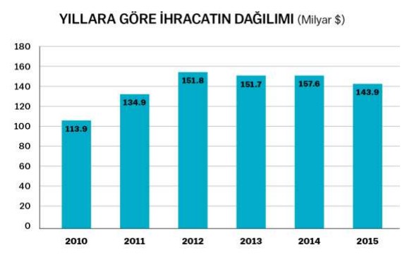 Türkiye’nin 2015 yılında ihracatı 143.9 milyar dolar oldu. Toplam ihracatta 2014 yılına göre %8.7 düşüş yaşandı.
