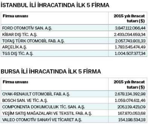 Türkiye’nin en fazla ihracat yapan ili toplam 40.8 milyar dolar ihracat ile 2015’te de İstanbul oldu. Bursa 6.3 milyar dolar ile bu yıl Kocaeli’nin önüne geçerek ikinci sıraya yerleşti.