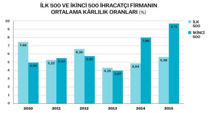 İlk 500 içerisindeki ihracatçı firmaların ortalama karlılığı 5,38 iken ikinci 500’de ortalama karlılık oranı 9,71 olarak gerçekleşmiştir.