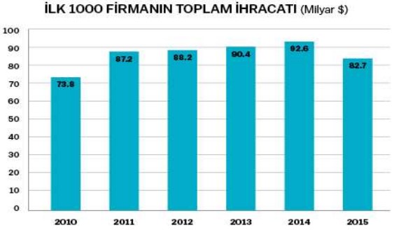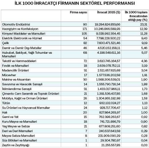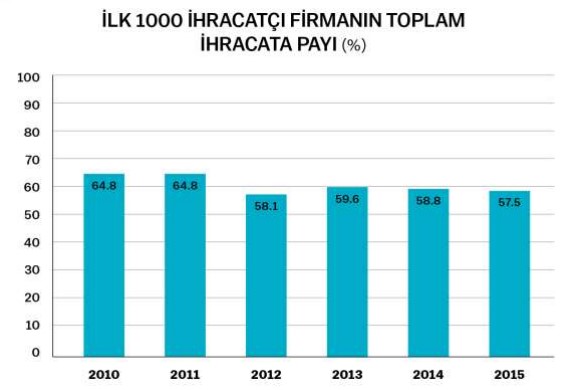 2015 yılında Türkiye’nin 143.9 milyar dolarlık toplam ihracatının %57.5’sını İlk 1000’de yer alan ihracatçı firmalar gerçekleştirdi.