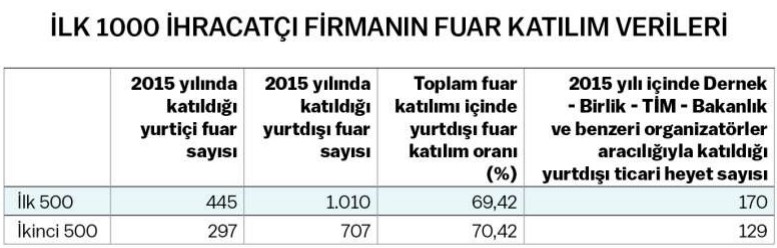 2015 yılında İlk 500 firma 1010, İkinci 500 ise 707 yurtdışı fuara katıldığını bildirildi. (Fuar katılımları ile ilgili bilgi veren firmalar dikkate alınmıştır.)