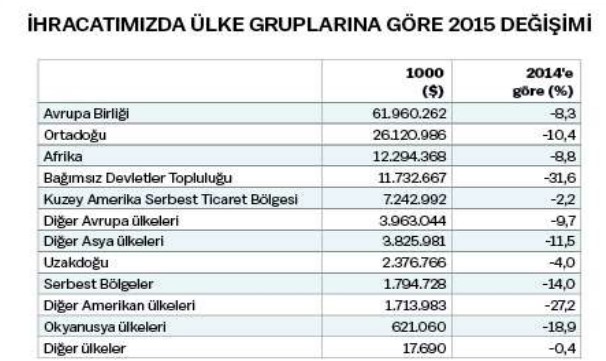 2015’te en büyük ihracat daralması Irak ve Almanya pazarlarında yaşandı. Almanya’dan elde ettiğimiz ihracat geliri %11.4 düşerek 13.4 milyar dolar oldu. Irak’a 2015’te 8.5 milyar dolarlık ihracat yaptık.