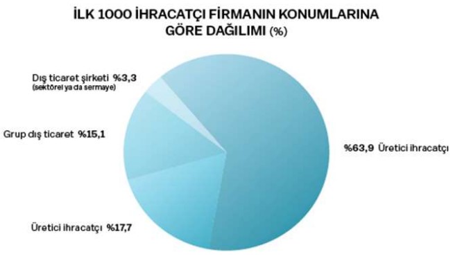 2015 yılında ilk 1000ihracatçı firmanın %63,9’unu üretici ihracatçı, %17,7’sini ihracatçı, %15,1’ini grup dış ticaret ve %3,3’ünü sektörel-sermaye dış ticaret şirketleri oluşturdu.